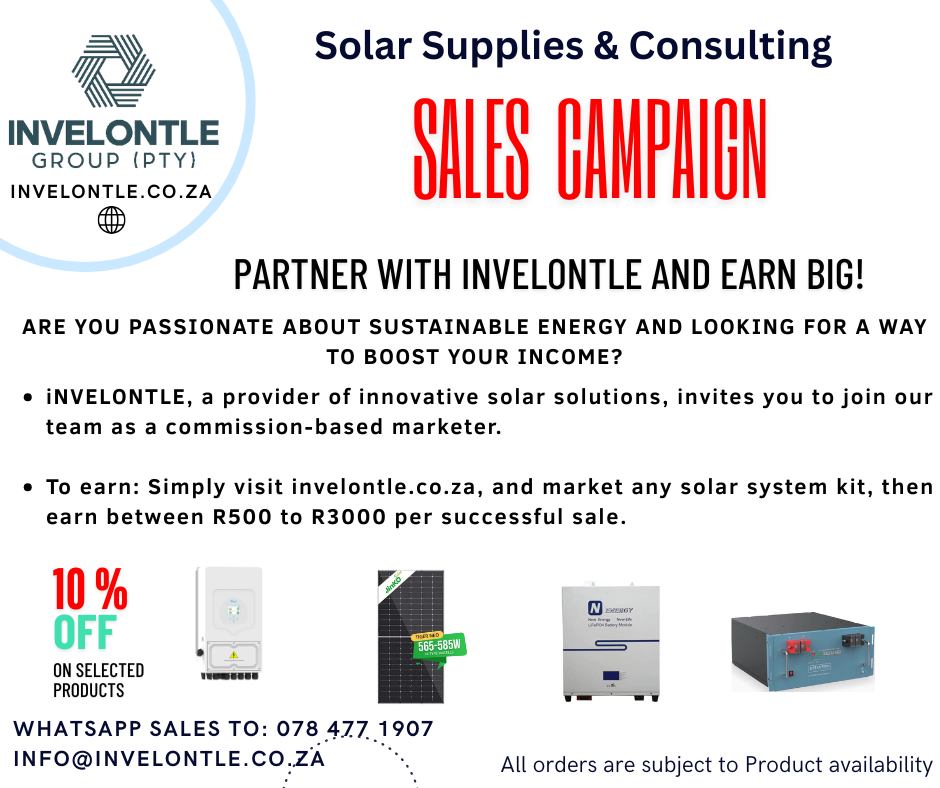 - To earn: Simply visit invelontle.co.za, and market any solar system kit, then earn between R500 to R3000 per successful sale.